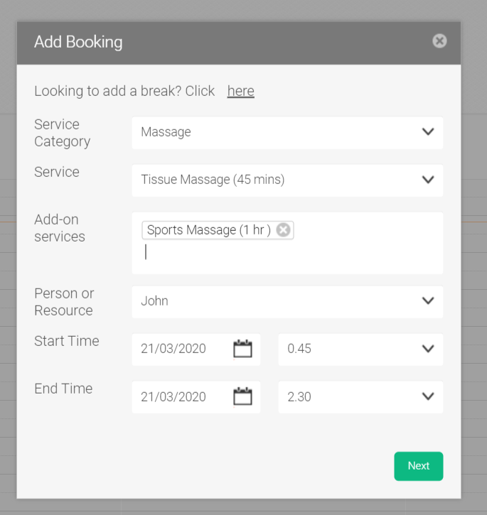 - Go to Admin >Calendar > Add Booking. You can also click at the correct time in the calendar and the same booking popup will appear.