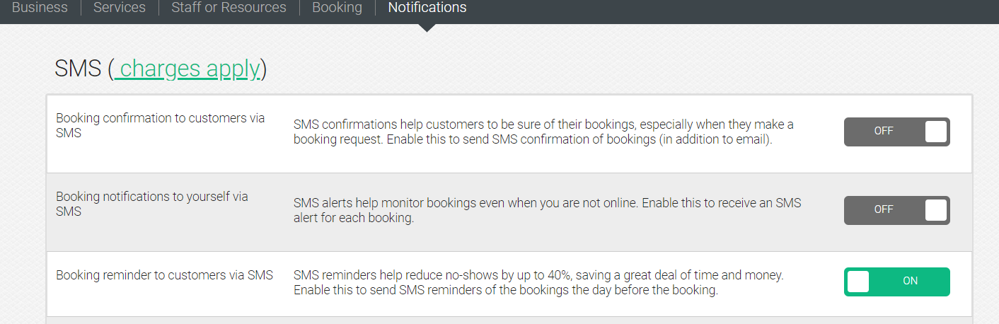 Customers with a valid mobile phone number in their profile will receive an SMS (charges apply) reminder the day before the appointment provided SMS reminders are enabled for your account.