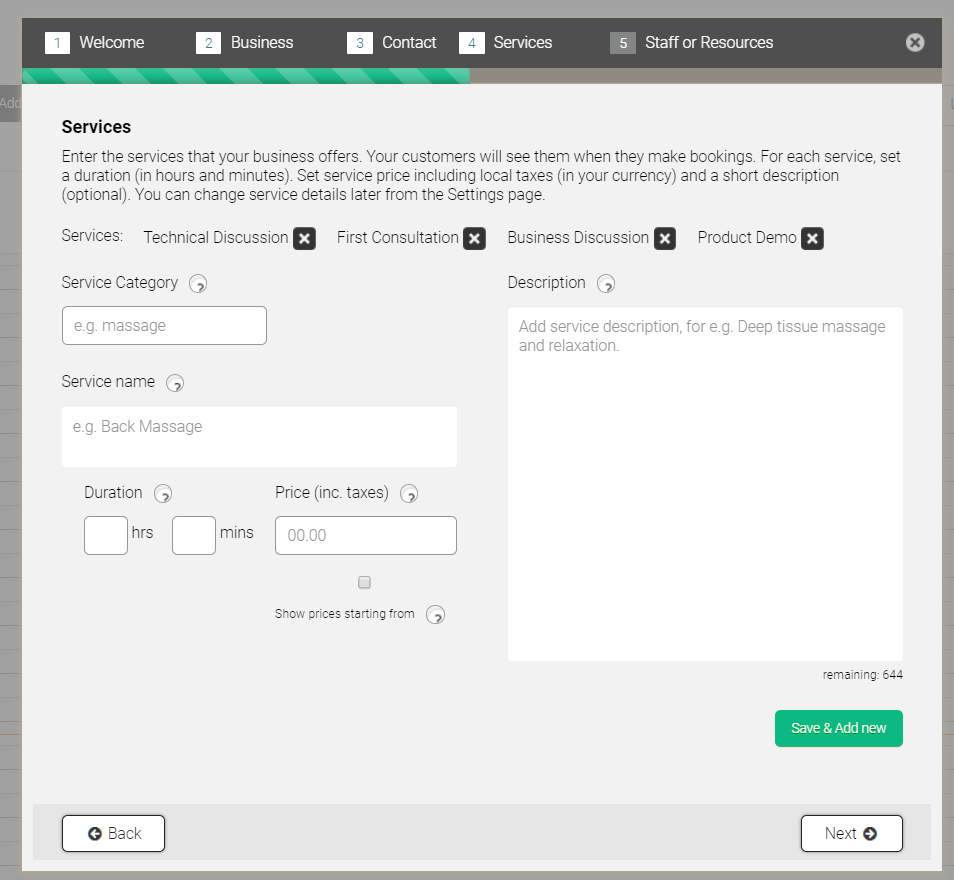 After logging in, the setup wizard will help you to fill in all the details like your services, staff or resources, business working hours and so on.